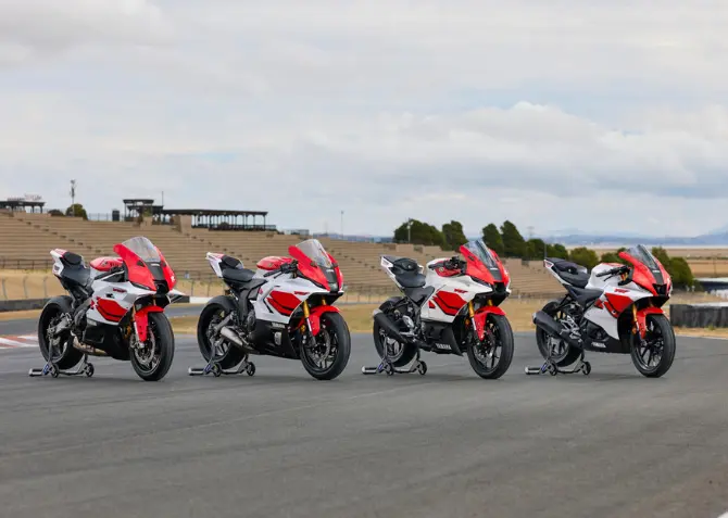 Yamahan Supersport-mallistosta tutut R9, R7 ja R125 ovat uudistuneet 2026 vuodelle, ja jokainen malli on saatavilla upeassa musta-puna-valko-juhlavuosivärissä.